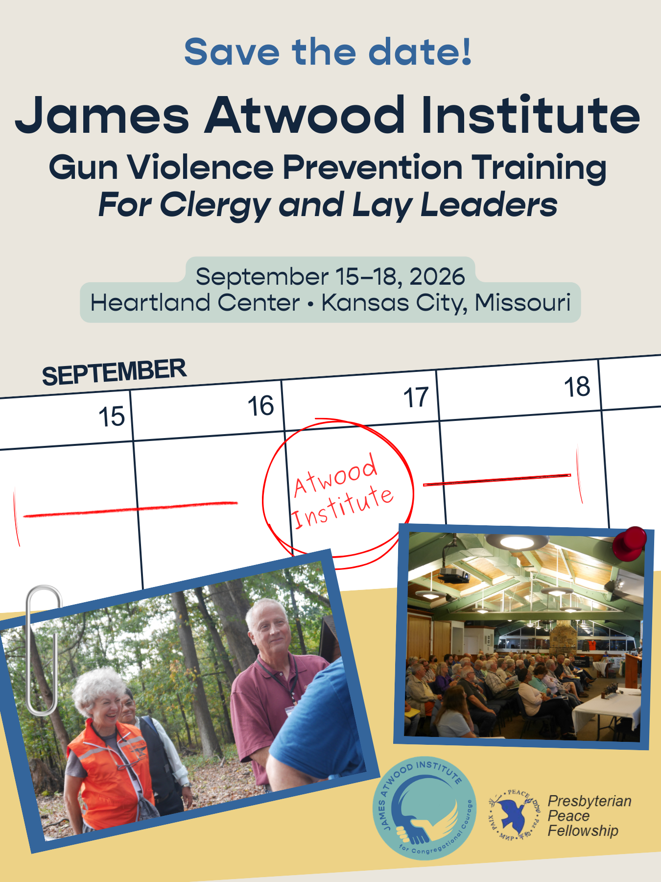 Join us for the James Atwood Institute for Congregational Courage, a Gun Violence Prevention training for clergy and lay leaders gathering in Parkville, MO near Kansas City, September 15–18, 2026.